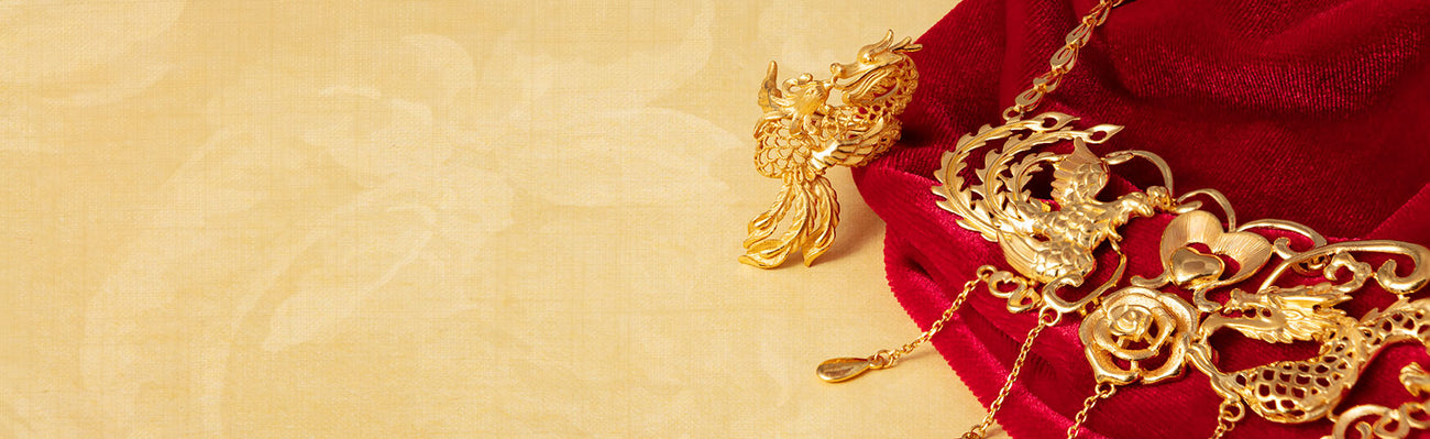 黄金在中国文化中长期以来一直与财富、奢华和吉祥有关。老凤祥采用最纯粹的24K足金制作无与伦比的龙凤婚庆珠宝。足金确保了珠宝闪烁着引人入胜的光泽,象征着新人之间充满光芒的爱情。这些珠宝的金黄色与传统旗袍服饰相得益彰,为新人的婚礼锦上添花。