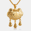 This 24K gold blessing pendant features a traditional cloud-shaped lock engraved with auspicious floral patterns and symbolic characters. Three gold bells hang from the base, offering gentle sound and movement meant to ward off negative energy and protect the wearer. Designed to celebrate peace, longevity, and prosperity, this pendant is a timeless heirloom for the Year of the Snake.