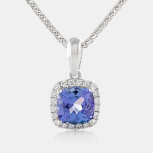 18K White Gold Daily Dose Diamond Halo Cushion Cut Tanzanite Pendant