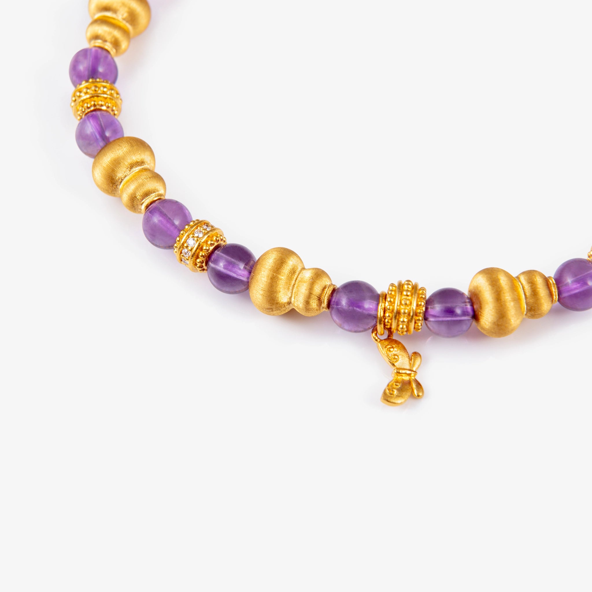 Amethyst symbolizes vitality, protection, and grounding strength. Paired with hulu beads in pure 24K Gold and illuminated with natural diamond accented gold cylinder charms the bracelet becomes a meaningful expression of good fortune.