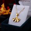 This 24K gold necklace features a shiny and elegant ginko leaf motif. The textured design brings movement and elegance to the neckline.