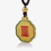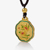 The peony (牡丹), known as the "king of flowers," represents wealth, nobility, and feminine grace in Chinese tradition. In this piece, vibrant red and green enamel blooms across a golden garden, framed by the plum blossom shape, a symbol of resilience. The reverse bears a red stylized seal, grounding the piece with dignity and balance.