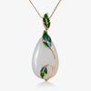 Design: Teardrop-shaped nephrite pendant adorned with intricate leaf enamel in green and blue